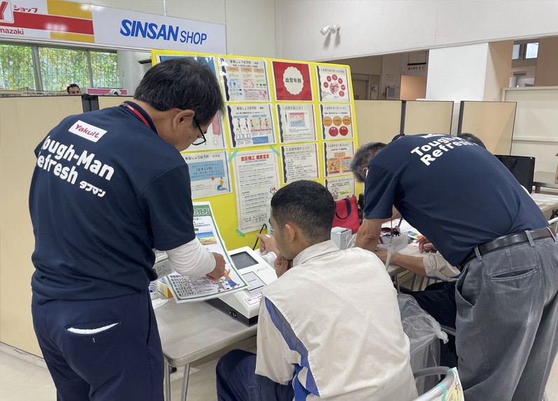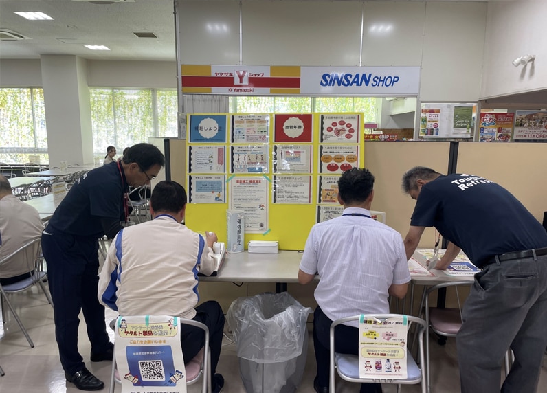 従業員が集まる社内健康診断時には健康ブースを設け、脂質や糖代謝などに関する展示などを行いました。従業員の健康意識を高 め、意識改善へと繋げています。