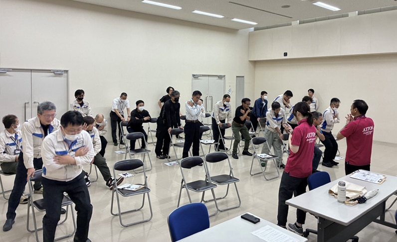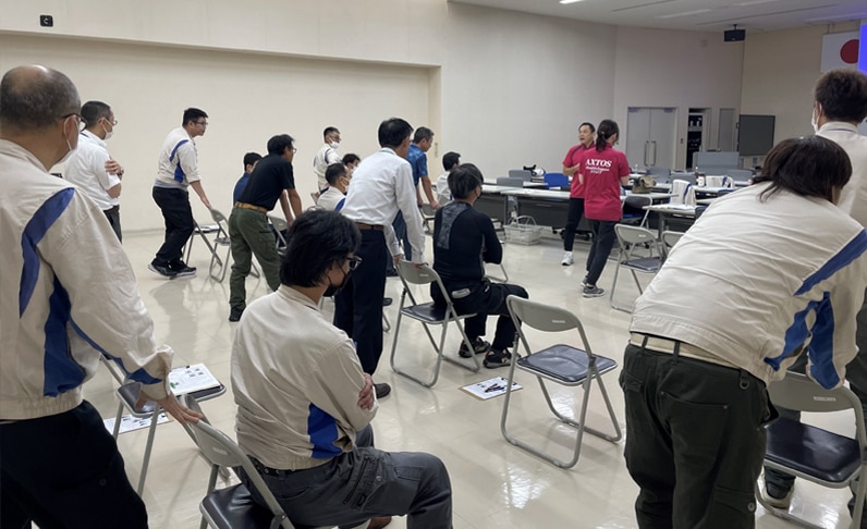 健康セミナーでは、「いきいき健康プログラム」と題して、50歳以上の従業員を対象に定年後もいきいきと過ごせる様、健康について講義と実際に基礎体力測定を行っています。運動機能向上や結果で見えた課題を自宅で簡単にリカバリーできる運動メニューを紹介し、皆さんの意識改革に繋げています。